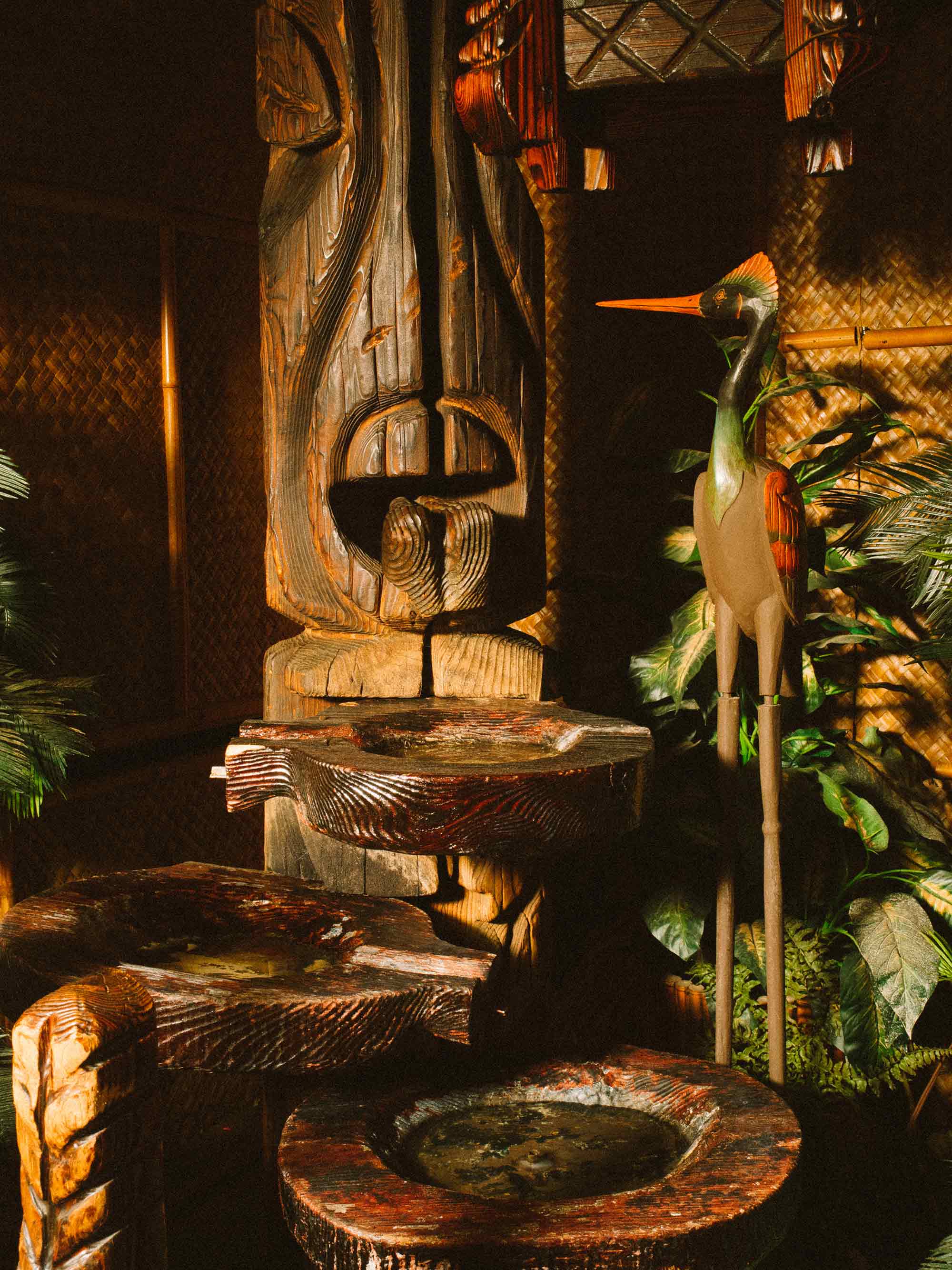 The bar hasn’t made many concessions to the end of the original tiki wave. Cocoa palm matting and tikis mounted on leopard skin-covered frames decorate the walls. The building’s few windows offer a view of a sheltered patio filled with greenery and large tiki sculptures. Inside, a bamboo canopy festooned with lit-up pufferfish hangs over the front bar, while clusters of plastic fruit strung together with holiday lights dangle from a seagrass-covered ceiling in the back room. The lounge is also known among tiki fans for its extensive collection of Witco, dark wood carvings produced during the mid-twentieth century by the Washington-based Western International Trading Company. The bar’s pieces, which include stringed instruments on the wall and a large fountain that has started to leak, inspired tiki historian Sven Kirsten, author of the 2007 book “Tiki Modern,” to call the Hala Kahiki the “King Tut’s Tomb of Witco.”