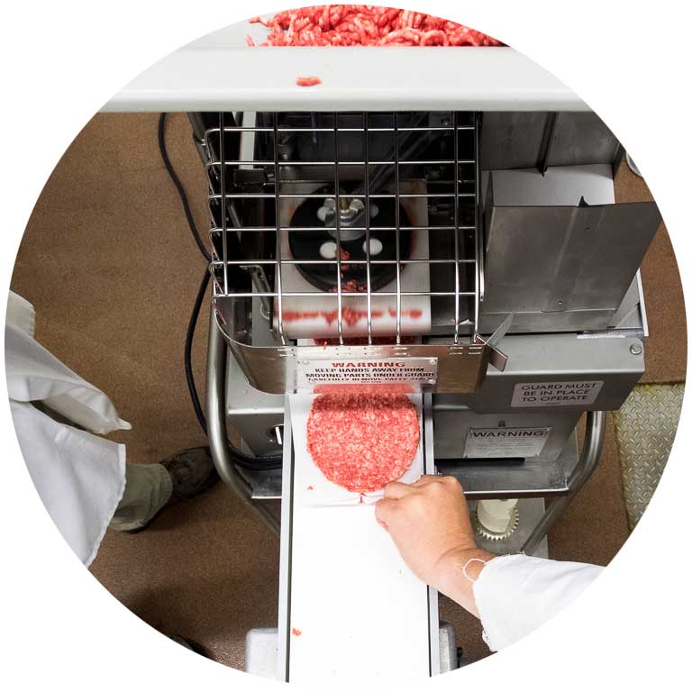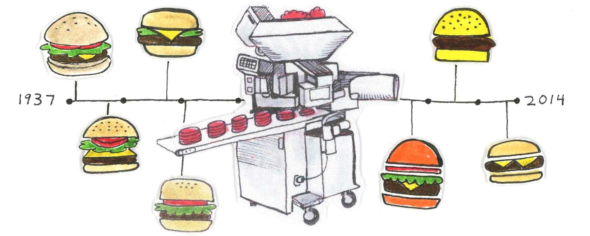 The company’s current bestseller, the Super patty machine, looks quite different from Holly’s wooden press but at its heart remains close to the inventor’s vision of efficiency and reliability. Originally named the Super 54 for the year it was developed, the machine fits on a countertop and can produce 2,100 patties an hour. Ground meat is fed through a large hopper on top and gets squeezed through a narrow compartment before being molded into patties, each one knocked out of the machine with a distinctive “thunk” sound. The Super stacks the finished patties, automatically sliding a square of waxed paper between each one, and moves the columns down the conveyor belt.