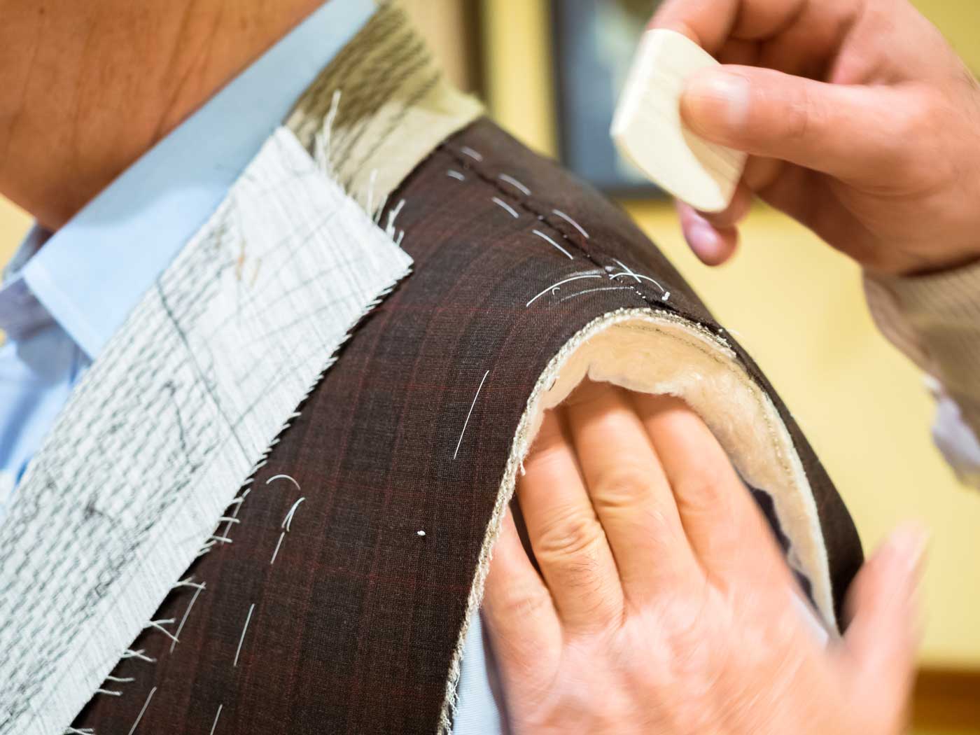 Richard Bennett’s tailors then create a pattern out of brown paper and use the templates to cut a garment’s component pieces from fabric, making sure any stripes and plaids are matched perfectly in every direction. At the first fitting for a suit jacket or sport coat, the customer tries on what looks like a big vest; there are no sleeves, collar, lapel or linings. After the tailor confirms the posture, shoulder line, chest size and length are correct, the garment returns to the shop for more work. By the second fitting, the jacket will be nearly complete.