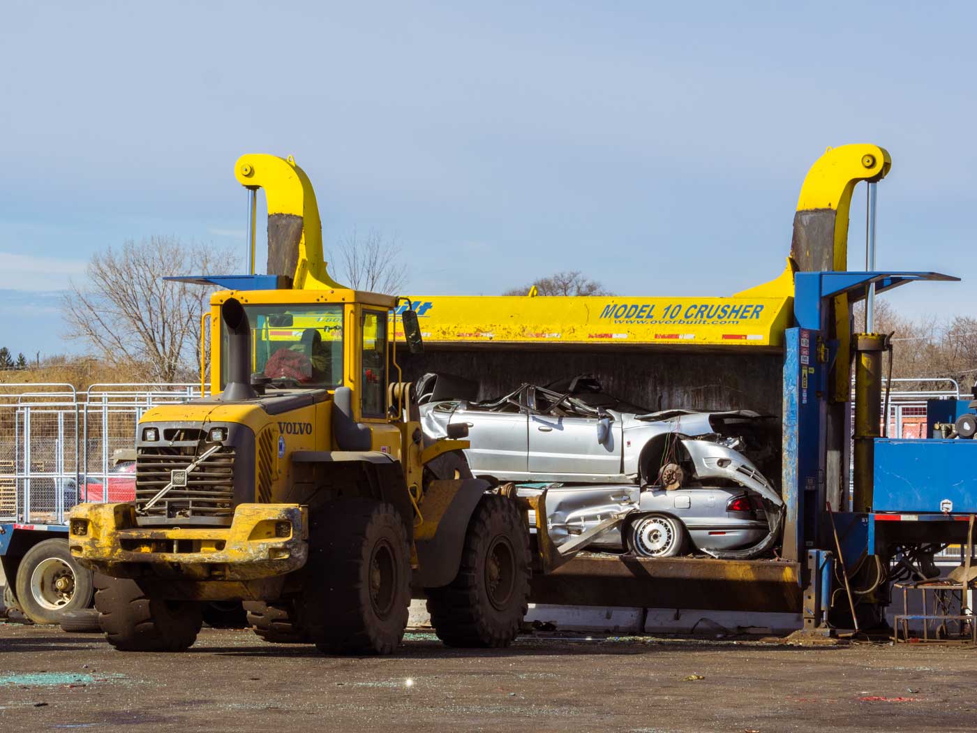 The crushing process takes just 60 seconds, but it’s a noisy and action-filled minute. The body of the car begins to crumple, then the windows and windshields give way. Glass shatters and spews outward, creating a green and blue mosaic on the asphalt. The loader places another car on top of the flattened carcass, and the process repeats until a compressed stack of three cars, called a bundle, is created. Four bundles make a load, which Victory sells to metal recyclers that further process the scrap by shredding it into fist-size pieces, separating ferrous from nonferrous metals, and remelting the iron and steel.