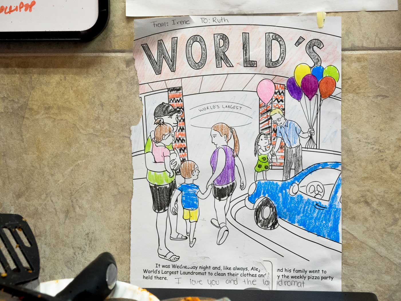 That realization was responsible for what’s become the hallmark of the World’s Largest Laundromat: its family-friendly atmosphere. It’s why Benson serves free pizza on Wednesday evenings and hired a student from the School of the Art Institute to draw a coloring book depicting a Latino family’s trip to the laundromat. (That same artist has made three editions of the coloring book since.) It’s why he started serving free donuts and coffee every day and set up a bird aviary, which he’d seen at the nursing home where his mother’s second husband lived.