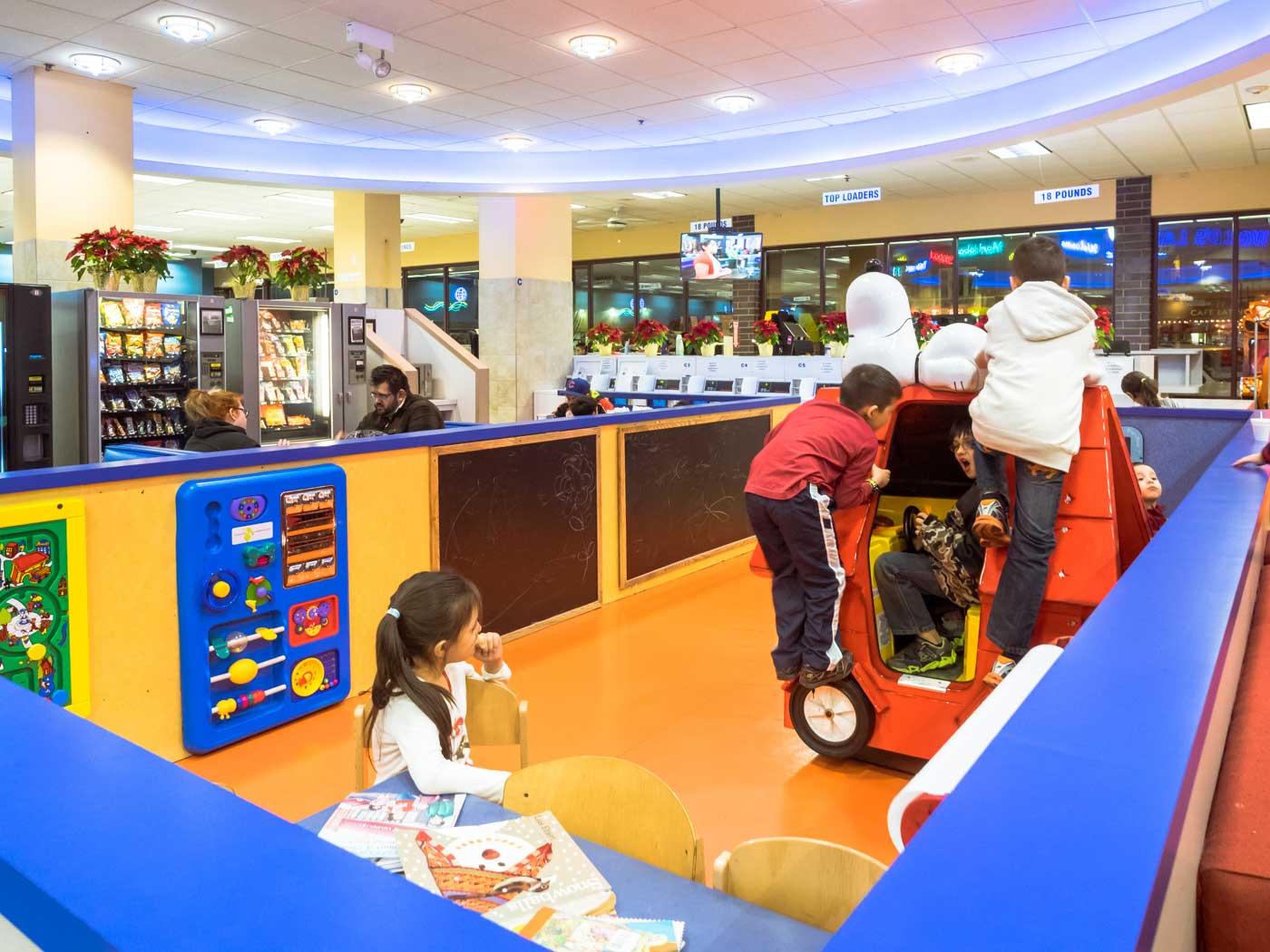 The World’s Largest Laundromat reopened in early 2006, and its customers returned. They came back for pizza night — the store serves 35 large pizzas on a typical Wednesday evening — and for the large TVs tuned to Univision and the Disney Channel, the free Wi-Fi, the face painting and magician and balloon animals. On a recent Wednesday with more than 100 people in the store, Benson and an employee served pizza from the front counter as a dozen kids sat in a circle around a young woman from a local children’s fitness center, belting out “Heads, Shoulders, Knees and Toes.” Other kids did homework at metal school desks or perched on counters with their smartphones. One couple pushed a laundry cart with a slightly askew car seat inside it, their baby girl blinking uncomprehendingly at the lights and noise of the nearby The Fast and the Furious arcade game.